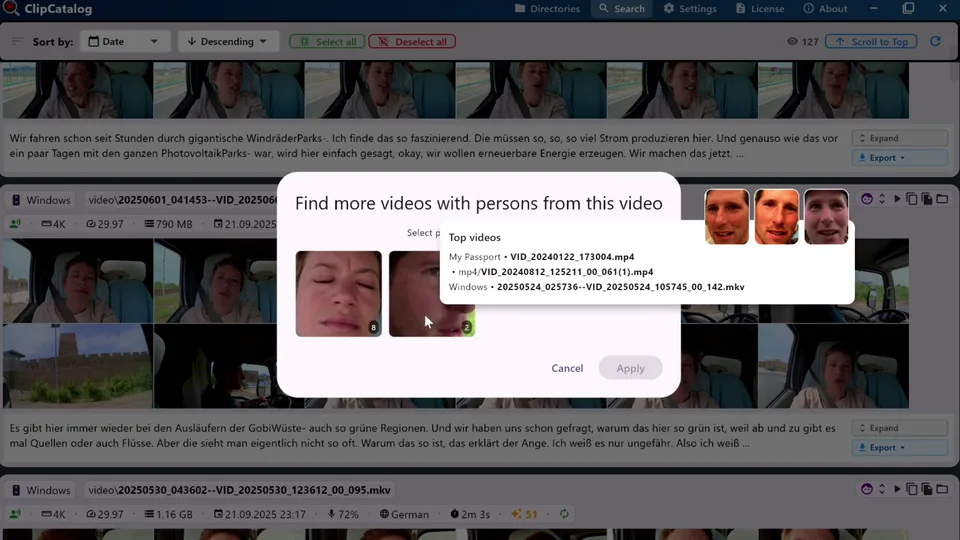 Suchen Sie per Gesicht über lokale Ordner, externe Laufwerke und alte Archive hinweg. ClipCatalog gruppiert wiederkehrende Personen lokal, damit Sie passende Clips schnell finden, ohne sich auf Dateinamen oder Ihr Gedächtnis verlassen zu müssen.